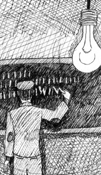 At the end of the hall, the Bookie waits in an office lit by a 40-watt bulb, weighing the odds on a great chalkboard. Once in awhile he lets you win, just to keep you hooked. Every time you break the house, you’ve got to make it up, and he’ll put your soul in hock at no additional charge in order to pay the debt.