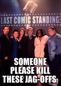 The least funny and saddest show on television right now has to be Last Comic Standing. Anyone watched this tragedy? It's a reality show about wannabe comedians living together in a house to see what happens when people stop being funny, and start getting disturbingly whiney and absolutely unfunny. Yeah, it's like MTV's The Real World, but with anti-funny, pseudo-comedians, instead of spoiled sorority girls, muscle heads, token gays, and drunken "virginal" sluts.