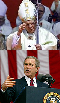 "President" Bush and Pope John Paul II have recently addressed issues regarding "reserving marriage for heterosexuals" and "fighting against gay marriages". As if marriage were a table in a restaurant or an enemy country. It's humorous that a country that lets Elvis marry couples is now saying that the institution of marriage is such a holy and sacred thing that it needs to be reserved strictly for a select group.