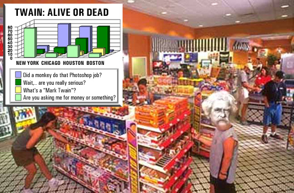 HANNIBAL, MO - Last Thursday at a 7-11 on Brown Street, Tom Twinning claims to have spotted famed humorist Mark Twain purchasing a package of Twinkies and some Swisher Sweets cigars.